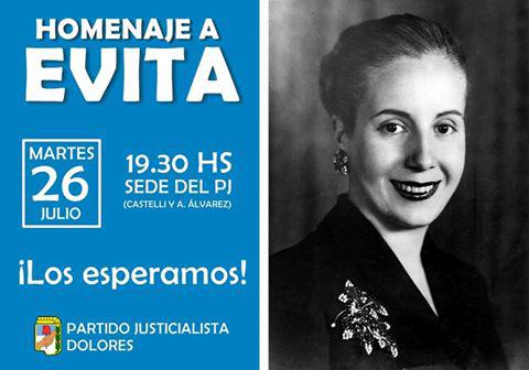 El Partido Justicialista invita al Acto en conmemoración del fallecimiento de “Evita”. Martes 26 de julio 19.30hs en la Sede del PJ.