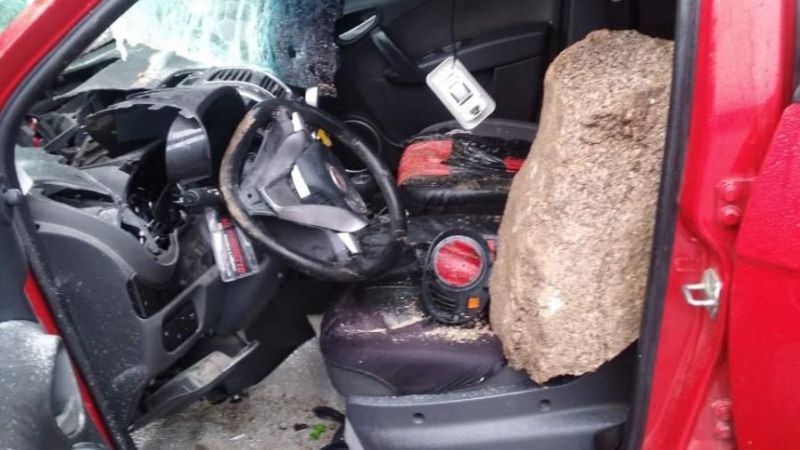 Una roca cayó sobre un auto y una mujer se salvó de milagro