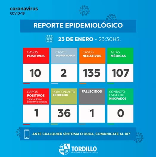 El intendente Héctor Olivera a través de la Secretaría de Salud del Municipio de Tordillo pone a disposición de la comunidad el informe epidemiológico de este sábado 23 de enero , basado en datos de la Secretaría de Salud del Municipio de Tordillo.