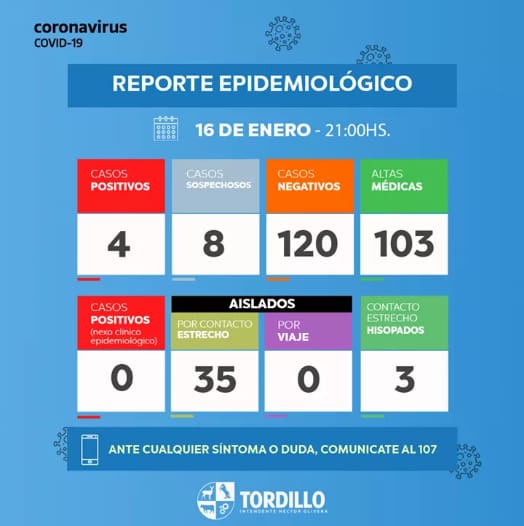 El intendente Héctor Olivera a través de la Secretaría de Salud del Municipio de Tordillo pone a disposición de la comunidad el informe epidemiológico de este sábado 16 de enero , basado en datos de la Secretaría de Salud del Municipio de Tordillo.