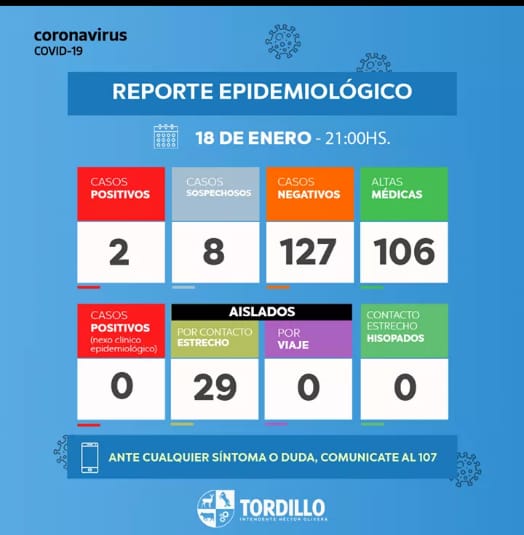 El intendente Héctor Olivera a través de la Secretaría de Salud del Municipio de Tordillo pone a disposición de la comunidad el informe epidemiológico de este domingo 17 de enero , basado en datos de la Secretaría de Salud del Municipio de Tordillo.