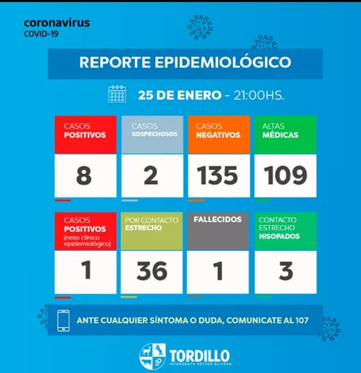 El intendente Héctor Olivera a través de la Secretaría de Salud del Municipio de Tordillo pone a disposición de la comunidad el informe epidemiológico de este lunes 25 de enero , basado en datos de la Secretaría de Salud del Municipio de Tordillo.