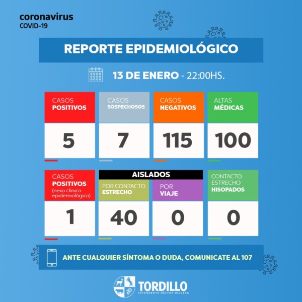 El intendente Héctor Olivera a través de la Secretaría de Salud del Municipio de Tordillo pone a disposición de la comunidad el informe epidemiológico de este miércoles 13de enero, basado en datos de la Secretaría de Salud del Municipio de Tordillo.