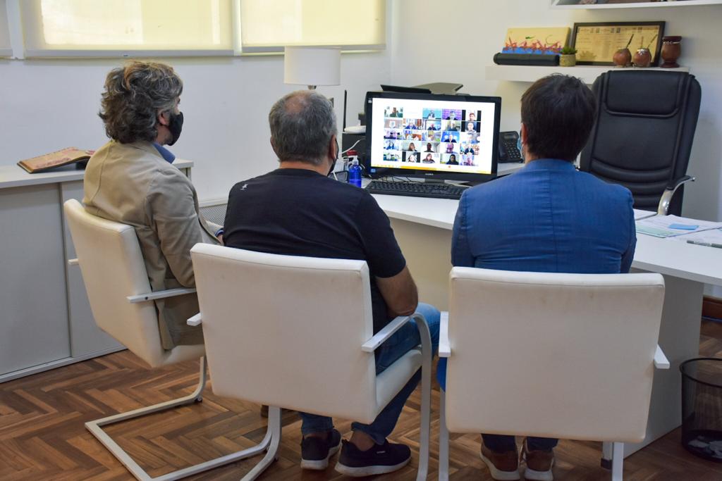 A través de videoconferencia, el Intendente Francisco Echarren junto al Secretario de Campo y Producción Ignacio Larralde y al Subsecretario de Obras Públicas Federico Longhi, participaron del anuncio del convenio que otorga casi 100 millones de pesos para la mejora de los caminos rurales de Castelli.