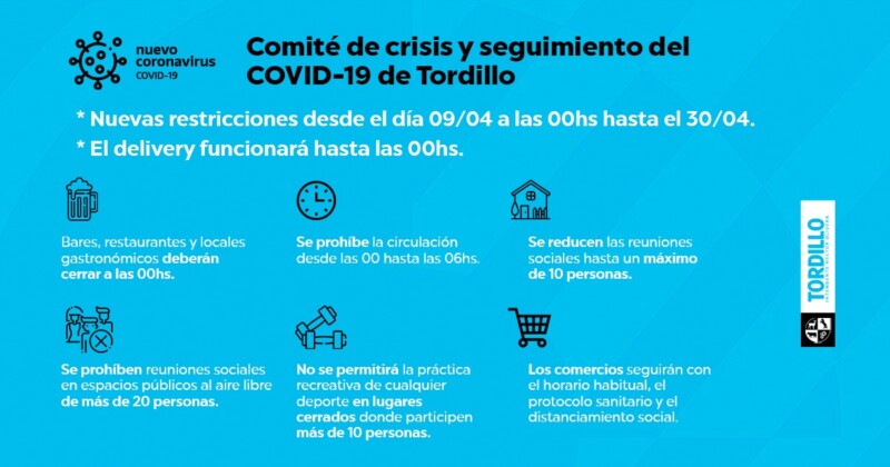 Por el momento estas medidas alcanzan a lo establecido por el Poder Ejecutivo de la Nación, anunciado el pasado miércoles por el presidente Alberto Fernández. Estas establecen el cierre de los comercios y la prohibición de circular entre las 00:00 y las 06:00 horas. Las actividades colectivas tales como las propias de las Escuelas Deportivas o las reuniones sociales están permitidas con respeto del número máximo de 10 (diez) concurrentes, con la implementación del protocolo de higiene y distanciamiento entre personas y si y solo si no se registran casos positivos de coronavirus.