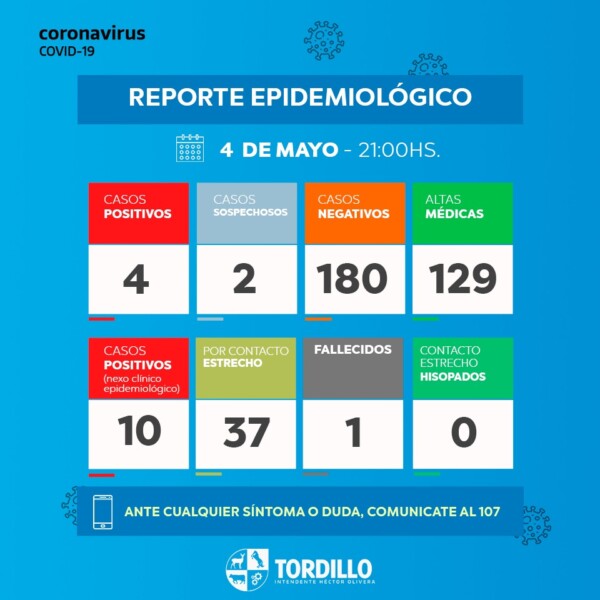 El intendente Héctor Olivera a través de la Secretaría de Salud del Municipio de Tordillo pone a disposición de la comunidad el informe epidemiológico de este martes 4 de mayo, basado en datos de la Secretaría de Salud del Municipio de Tordillo.