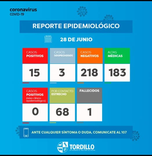 El intendente Héctor Olivera a través de la Secretaría de Salud del Municipio de Tordillo pone a disposición de la comunidad el informe epidemiológico de este lunes 28 de junio, basado en datos de la Secretaría de Salud del Municipio de Tordillo.