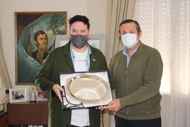 En el encuentro, el Jefe Comunal le dio la bienvenida en nombre de todos dolorense y lo felicitó por todos sus logros, además se le hizo entrega de un libro del Bicentenario, un set matero del Parque Termal Dolores, un cuadro realizado por la Profesora Georgina Chaar del taller de pintura de la Dirección de Juventud, un presente del curso de Cerámica de la Secretaría de Cultura y una placa en reconocimiento a su trayectoria profesional.