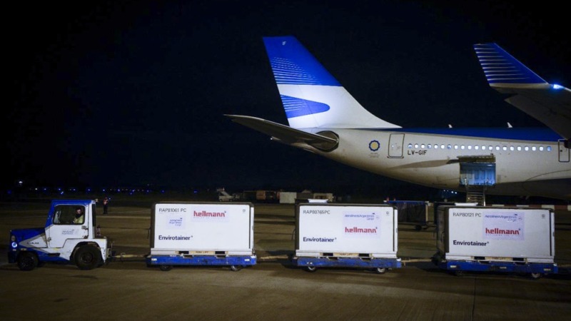 Las dosis de AstraZeneca, que completaron su elaboración en la planta AMRI de Albuquerque (Estados Unidos), llegaron a Ezeiza este lunes a las 10 en el vuelo de la compañía Latam Cargo Colombia, bajo el número UC1407.