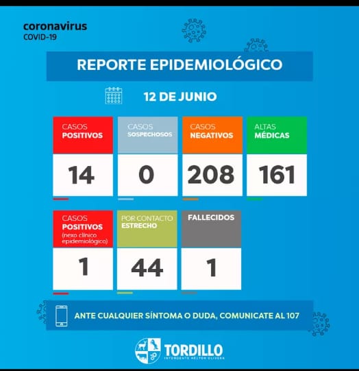 El intendente Héctor Olivera a través de la Secretaría de Salud del Municipio de Tordillo pone a disposición de la comunidad el informe epidemiológico de este sábado 12 de junio, basado en datos de la Secretaría de Salud del Municipio de Tordillo.