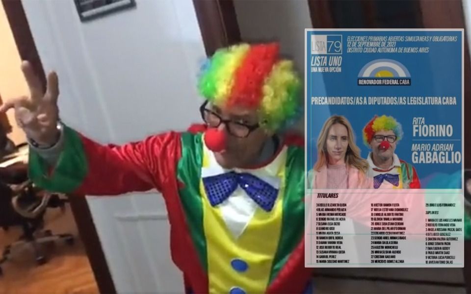 Sin embargo, la polémica está vinculada con la boleta que se presenta para el cuarto oscuro, donde está vestido con un colorido atuendo payasesco. Pero no se sabe si esa imagen será avalada por la Cámara Electoral.