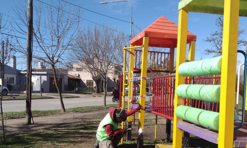 Continuando con las tareas de mantenimiento personal de la Dirección de Espacios Verdes, efectuó reparaciones en juegos de la plaza Soldado Dolorense. Se hicieron refuerzos en caños de toboganes y se continuará con el pintado de todos los juegos.