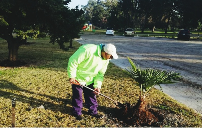 Empleados de la Dirección de Espacios Verdes realiza tareas de mantenimiento de palmeras y canteros en la Plazoleta Rotary Club, que se encuentra en el acceso al Parque Libres del Sur..
