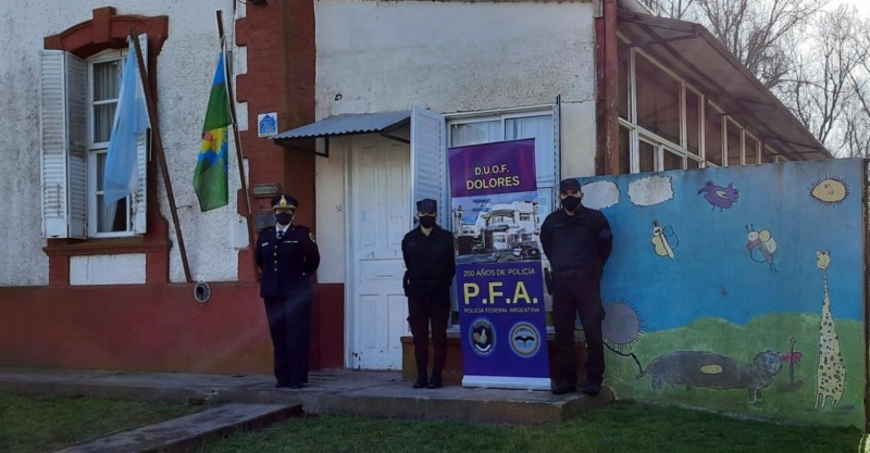 En el marco de los Festejos del Día de las Infancias, DUOF DOLORES de POLICÍA FEDERAL, a cargo accidental del Subcomisario Claudia Inés Chávez y personal, hizo entrega de obsequios a los alumnos de la Institución que apadrina, Jardín Rural N° 904 La Flor del Ceibo del Paraje Sevigné.