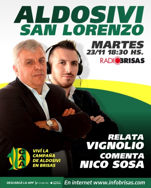 Martes 23 de noviembre, a partir de las 18.30 horas, por Radio Brisas, desde el Estadio José María Minella, Aldosivi-San Lorenzo. Relata Eduardo Vignolio, comenta Nico Sosa.