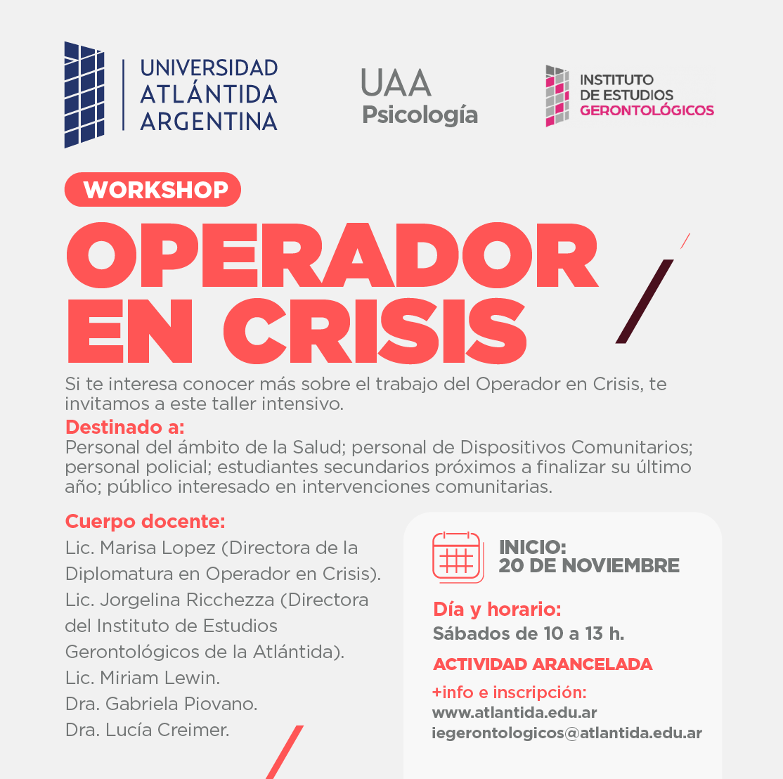 Si te interesa conocer más sobre el trabajo del Operador en Crisis, te invitamos a este taller intensivo, que estará a cargo de un cuerpo docente de profesionales: Lic. Marisa Lopez (Directora de la Diplomatura en Operador en Crisis), Lic. Jorgelina Ricchezza (Directora del Instituto de Estudios Gerontológicos de la Atlántida), Lic. Miriam Lewin, Dra. Gabriela Piovano y Dra. Lucía Creimer.