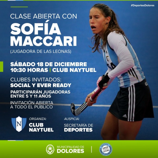 Con la organización del Club Naytuel y el auspicio de la Secretaría de Deportes de la Municipalidad de Dolores, Sofía Maccari (jugadora de Las Leonas), brindará una clase abierta de hockey el sábado 18 de diciembre a las 10.30 horas, en el predio del Club organizador.