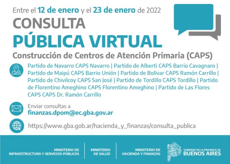 Se trata de los CAPS a construir en los Partidos de Alberti, Bolívar, Chivilcoy, Florentino Ameghino, Las Flores, Maipú, Navarro y Tordillo. La iniciativa virtual comienza el 12/01 y se extiende hasta el 23/01 inclusive.