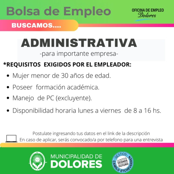 Ante dudas o consultas dirigirse por medio de las siguientes vías: WhastApp: 2245406420.Teléfono fijo: 446580/ 446060 int.155. Mail: oficinaempleodolores@gmail.c
