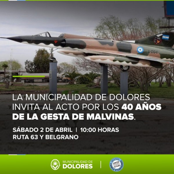 La Municipalidad de Dolores invita al acto por el 40º Aniversario de la Gesta de Malvinas, que se llevará a cabo el sábado 2 de abril a las 10.00 horas en el “Monumento Histórico”, ubicado en calle Belgrano y Ruta 63, conforme el siguiente detalle:
