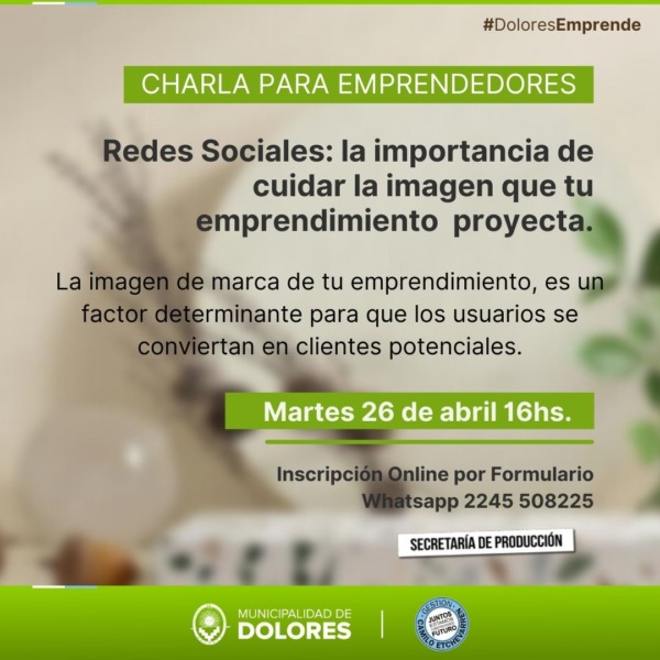 La Municipalidad de Dolores por medio de la Secretaría de Producción, invita a la charla para emprendedores y público en general: “Redes Sociales; la importancia de cuidar la imagen que tu emprendimiento proyecta”, a realizarse el martes 26 de abril a las 16.00 horas en el Salón Blanco Municipal, a cargo del publicista Lucio Napolitano.
