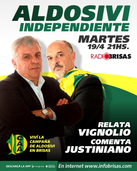 Martes 19 de abril, desde las 21.00 horas, por Radio Brisas, Independiente-Aldosivi. Relata Eduardo Vignolio, comenta Justiniano.