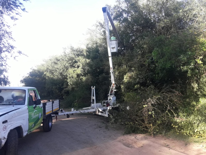 Personal de la Dirección de Espacios Verdes está realizando limpieza de cableado mediante el uso de motosierra e hidroelevador en calle Washington.
