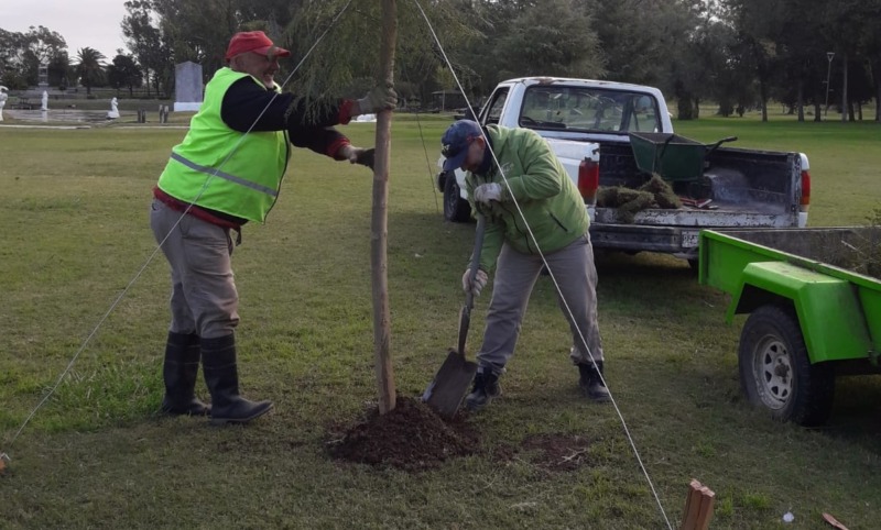 Personal de Espacios Verdes estuvo realizando la colocación de un Jacarandá en el Parque Libres del Sur, la planta fue donada por una vecina de calle Rauch.