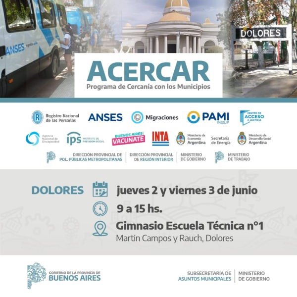 Este jueves 2 y viernes 3 de junio se realizará a un nuevo operativo del Programa #Acercar en #Dolores. Podrás asesorarte y realizar trámites de organismos nacionales, provinciales y municipales de forma más simple y rápida.