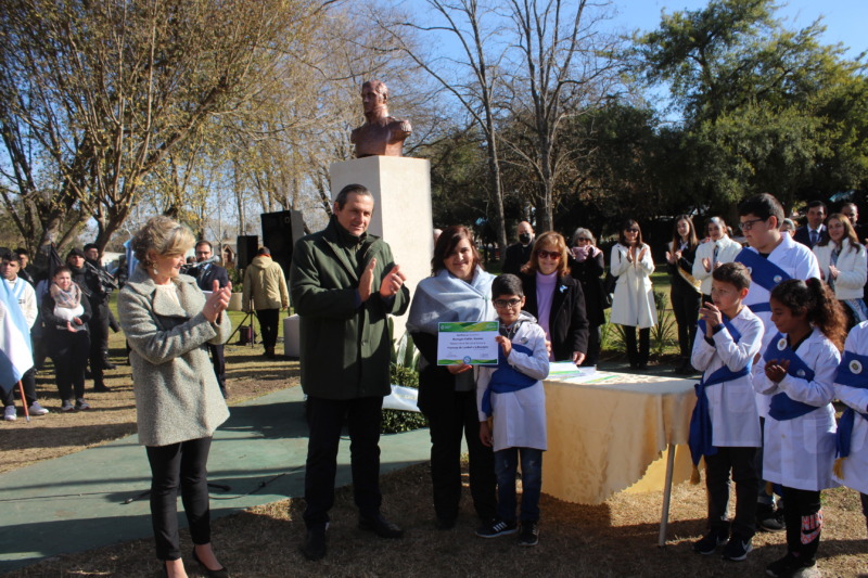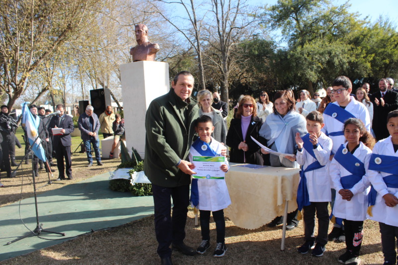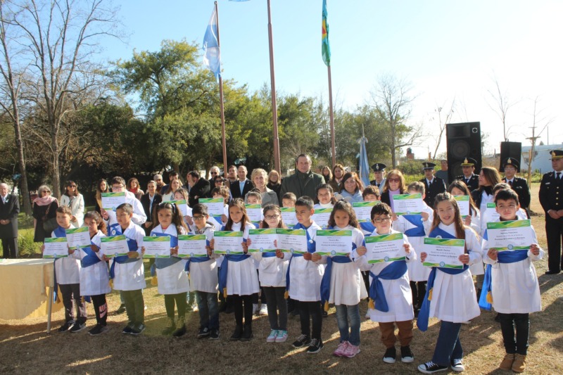 El recordatorio a los alumnos por la Promesa a la Bandera, fue entregado por el Intendente Camilo Etchevarren, la Jefe Distrital de Educación Adriana Iribarren,