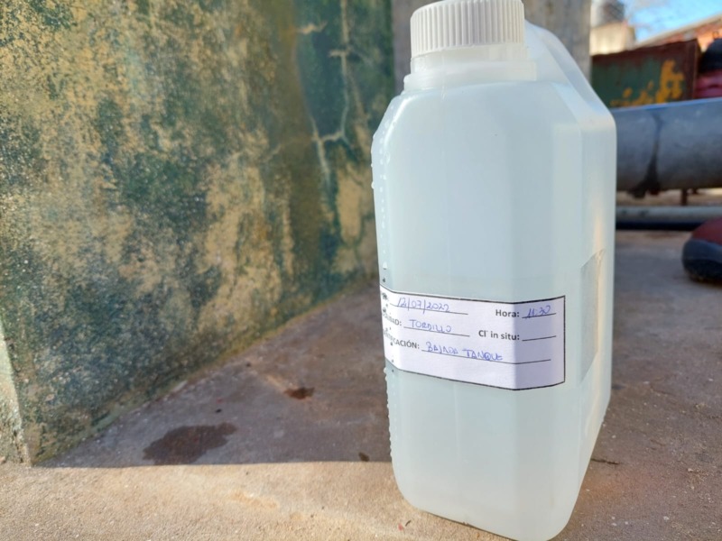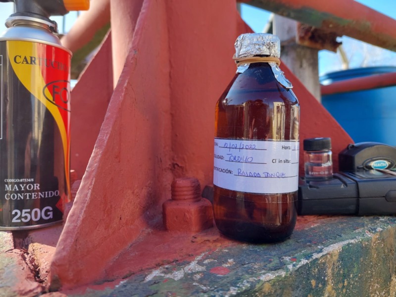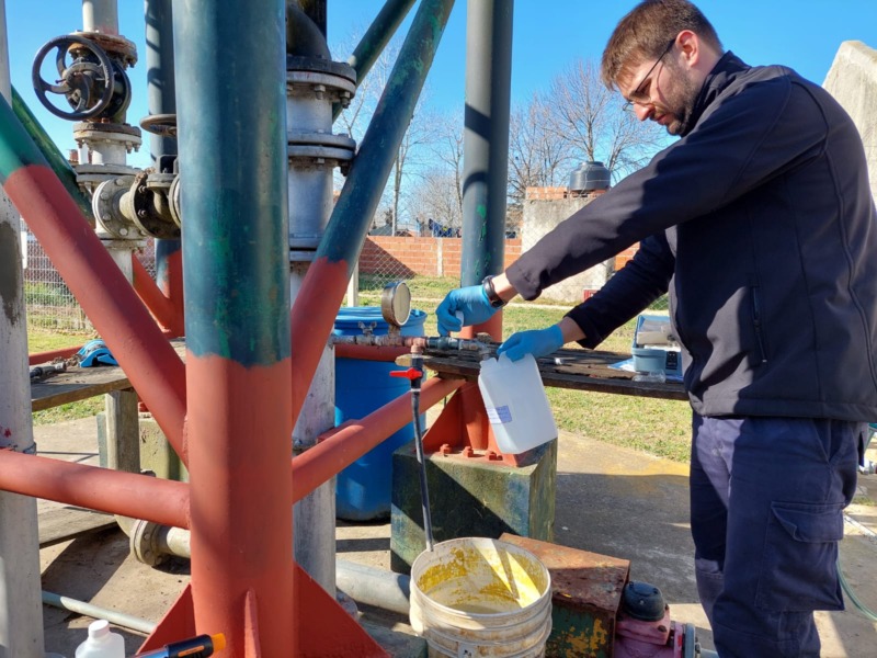 Julian Tujague del Departamento de Calidad y Sergio Cabrera del Departamento Técnico tomaron muestras de pozos, de la bajada del tanque principal y muestras domiciliarias elegidas al azar. Estas muestras fueron enviadas al laboratorio para su correspondiente análisis.