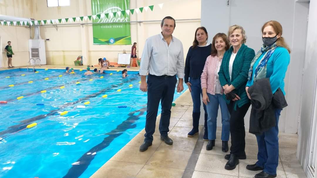 El Intendente Etchevarren junto a las Inspectoras de Educación Primaria, Eliana Manzo e Inés Castillo, la Secretaria de Educación María Esther Larregle y la Presidenta del Consejo Escolar Laura Clavero acompañaron el comienzo del Proyecto Distrital de Prácticas Acuáticas.