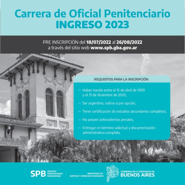 El Servicio Penitenciario Bonaerense (SPB) informa que se encuentra abierta la inscripción desde el lunes 18 de julio y hasta el 26 de agosto del presente año, para la carrera que en dos años formará a cadetes en oficiales de la repartición.