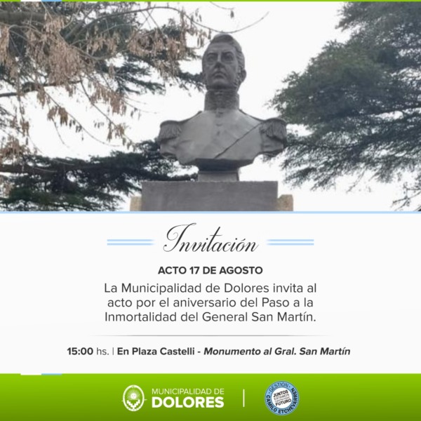 La Municipalidad de Dolores, invita al acto por el aniversario del Paso a la Inmortalidad del General San Martín, en el Monumento que se encuentra en Plaza Castelli, el miércoles 17 de agosto a las 15.00 horas.