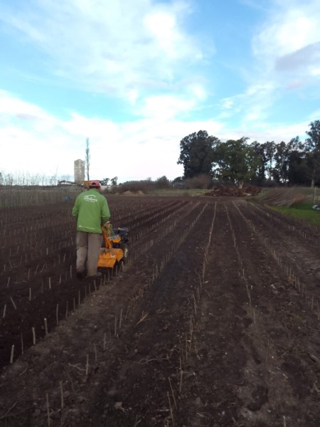 Personal de Espacios Verdes que trabaja en el sector del Vivero, se encuentra realizando mantenimiento en plantación de estacas de sauces, álamo piramidal y plateado. Las tareas se efectúan mediante el uso de motocultivador.