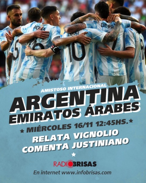 Miércoles 16 de noviembre, desde las 12:45 horas, por Radio Brisas, amistoso internacional, Argentina – Emiratos Árabes. Relata Eduardo Vignolio, comenta Justiniano.