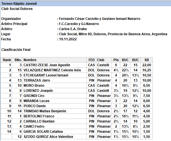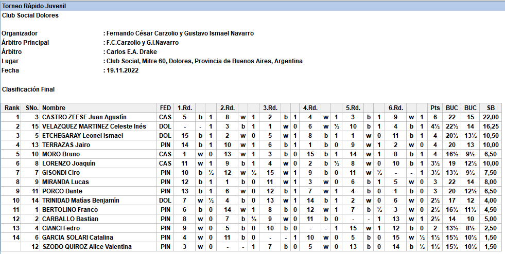 Un muy interesante Torneo Juvenil se realizó en el Club Social de Dolores, con intervención de jóvenes aficionados locales, así como de Castelli y de Pinamar. Con un ritmo de 15’/a finish por partida y por el sistema suizo a seis rondas, hizo suya la justa el castellense Juan Agustín Castro Zeese, quien hizo valer su mayor experiencia, siendo secundado por los dolorenses Celeste Inés Velázquez Martínez y Leonel Ismael Etchegaray. Mejor sub 12 fue el pinamarense Jairo Terrazas y mejor sub 16 Bruno Moro, de Castelli. Mejor sub 8 fue el pinamarense Ciro Gisondi. La organización, a cargo de Fernando Carzolio y Gustavo Navarro resultó impecable, quienes hicieron un agradecimiento especial a la entidad anfitriona, a Heladería Mummy’s y al Colegio de Abogados Departamental, quienes hicieron posible la fiesta.