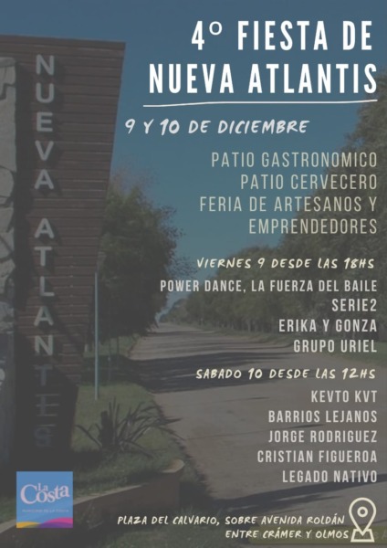 Este viernes 9 y sábado 10 se llevará a cabo la 4ª edición de la Fiesta de Nueva Atlantis. El evento, que cuenta con el acompañamiento de la Municipalidad de La Costa, se realizará en la Plaza del Calvario, ubicada en Avenida Roldán entre Cramer y Olmos.