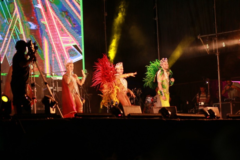Un muy colorido momento se vivió con la demostración del Carnaval de Corrientes, realizada por los representantes de dicha Provincia que están visitando nuestra ciudad y la presentación del grupo local Pasión Tropical.