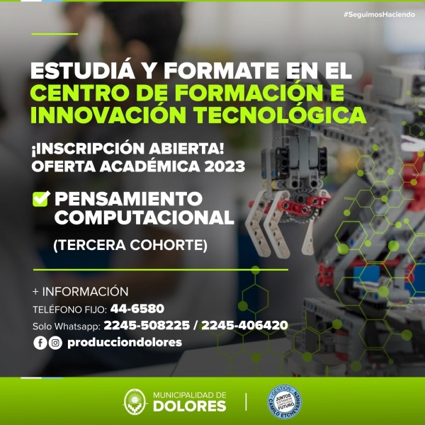 La Secretaría de Producción informa que aún se encuentra abierta la inscripción a la tercera cohorte del Curso de Pensamiento Computacional a dictarse desde el Centro de Innovación Tecnológico Municipal, esta vez de manera presencial. Dicha inscripción podrá hacerse por medio del siguiente link: