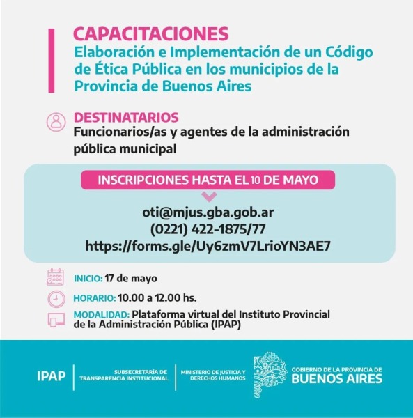 Hasta el 10 de mayo próximo estará abierta la inscripción para realizar el curso de capacitaciónEl Ministerio de Justicia y Derechos Humanos de la provincia de Buenos Aires a cargo de Julio Alak, informó que hasta el 10 de mayo próximo estará abierta la inscripción para realizar el curso de capacitación “Elaboración e Implementación de un Código de Ética Pública en los municipios de la provincia de Buenos Aires”, destinada a funcionarios, funcionarias y agentes municipales de los 135 distritos.En un nuevo avance en materia de políticas públicas sobre Transparencia, Integridad y Ética Pública que impulsa el gobernador, Axel Kicillof; la Subsecretaría de Transparencia Institucional de la cartera anunció que llevará a cabo la primera edición de 2023.La capacitación está dirigida a funcionarios, funcionarias y agentes de la administración pública municipal, con el objetivo de brindar conocimientos que permitan a cada gobierno municipal realizar su propio Código de Ética Pública, para generar un mecanismo preventivo que fortalezca la cultura de integridad y transparencia.La apertura, prevista para el 17 de mayo, estará a cargo de la subsecretaria de Transparencia Institucional, Ana Laura Ramos; y constará de cuatro encuentros a desarrollarse a través de la Plataforma Virtual del Instituto Provincial de la Administración Pública (IPAP), perteneciente a la Subsecretaría de Gestión y Empleo Público del Ministerio de Jefatura de Gabinete de la Provincia de Buenos Aires.Los interesados podrán inscribirse hasta el 10 de mayo en el siguiente linkhttps://forms.gle/Uy6zmV7LrioYN3AE7 , y también a través de las líneas telefónicas (0221) 422-1875/77 y del email oti@mjus.gba.gob.ar.