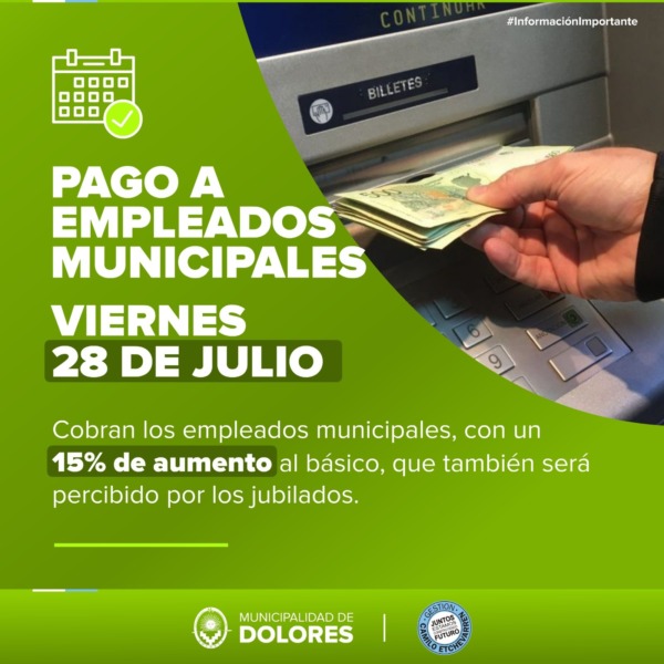 El viernes 28 de julio se acreditará el pago de haberes a empleados municipales en sus respectivas cuentas, correspondientes al mes de julio.