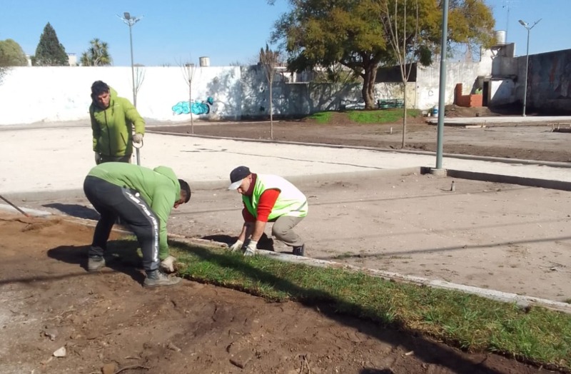 Personal de Espacios Verdes realiza la colocación de panes de césped en Plaza 25 de Mayo. Los mismos se extraen de Plaza Congreso de Tucumán, donde se están realizando veredas en sus laterales.