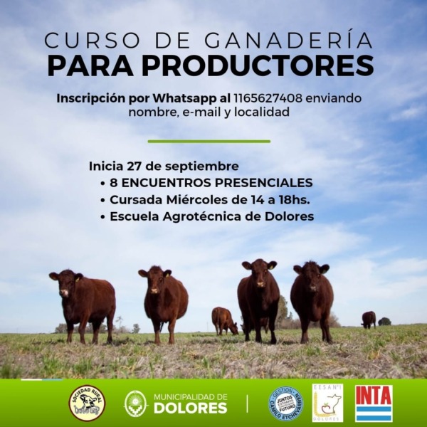 El Municipio de Dolores conjuntamente con la Sociedad Rural, el INTA y la Escuela Agropecuaria “Osvaldo Magnasco”, invitan al “Curso de Ganadería para productores”, un evento totalmente gratuito dictado por profesionales del Instituto Nacional de Tecnología Agropecuaria (INTA).