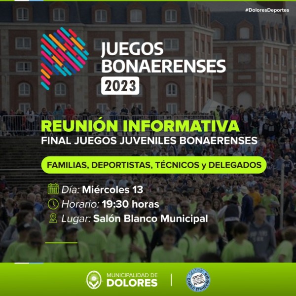 La Secretaría de Deportes comunica que el miércoles 13 de septiembre a las 19.30 horas en el Salón Blanco Municipal, se desarrollará una reunión informativa sobre la final de los Juegos Juveniles Bonaerenses 2023. Participarán padres, deportistas, técnicos y delegados. Durante el encuentro se les informará sobre los hoteles donde se hospedarán y que tipos de comidas contarán. Los lugares de competencias, la hora de salida y la logística que tendrá la delegación en Mar del Plata.
