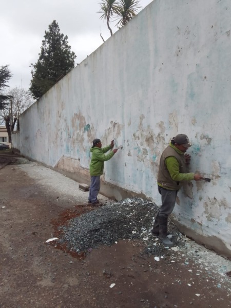 Continúan los trabajos en la Plaza 25 de Mayo, personal de Espacios Verdes realiza la preparación del paredón para pintura, en el sector donde se construirán canchas de futbol tenis y se colocará un tablero de básquet.