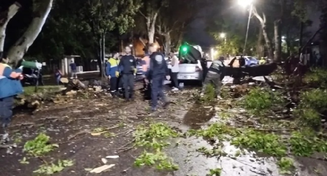 “Se constató la presencia de un árbol de gran porte sobre un vehículo con sus ocupantes aún en el interior. Se comienzan trabajos de corte de árbol y posterior corte de vehículo debido al total aplastamiento”, explicaron