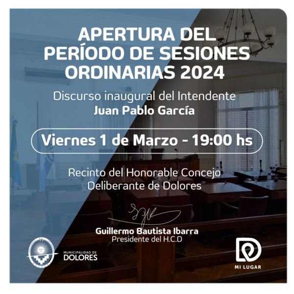 El próximo viernes 1 de marzo a las 19:00 horas, en el recinto del Honorable Concejo Deliberante, se llevará a cabo la Apertura del Periodo de Sesiones Ordinarias 2024 con el discurso inaugural del Intendente Juan Pablo García.
