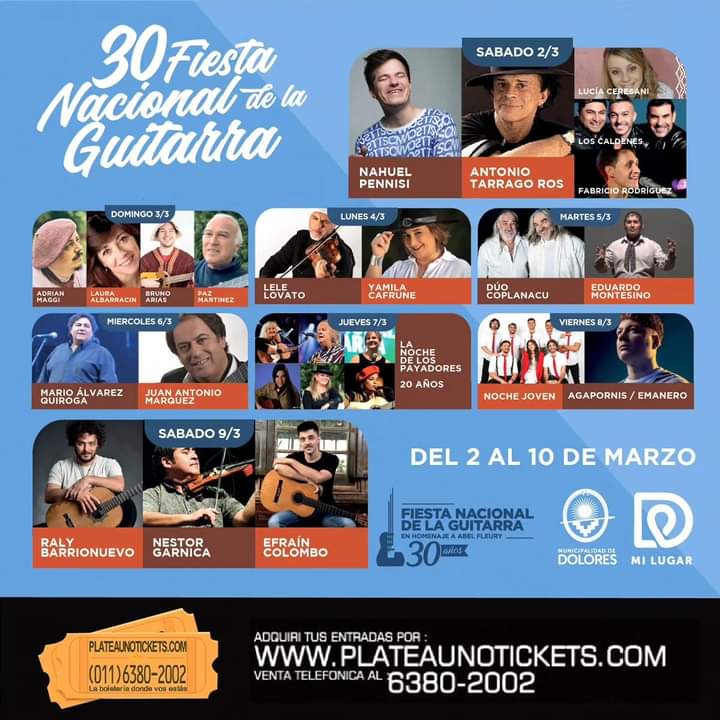 Las entradas para la 30° Fiesta Nacional de la Guitarra están a la venta a partir de hoy 1° de febrero, en la sede de la Secretaría de Cultura, en calle Mitre y 25 de Mayo. Se pueden adquirir en la sede de lunes a viernes de 7.30 a 18.30 horas, en efectivo, o por www.plateaunoticktets.com