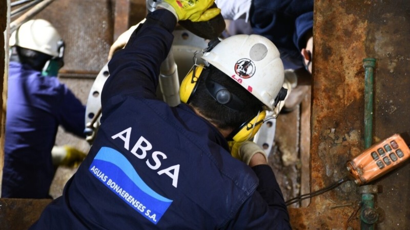 ABSA informa personal de mantenimiento de la región, trabaja en el reemplazo de una bomba en la Estación Elevadora de Agua de Dolores.